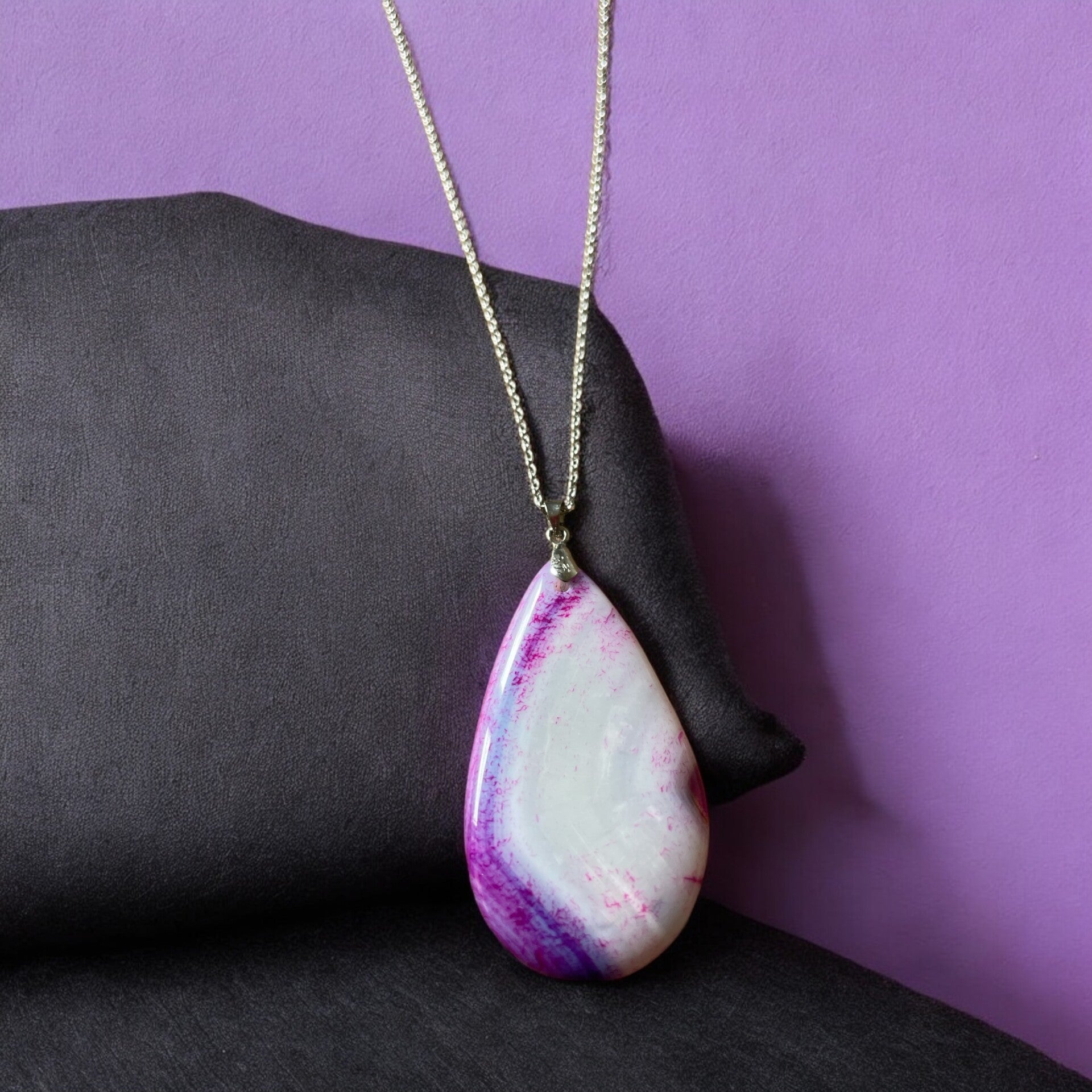 Deze plachtige paarse wit agaat hanger op een paarse kledingstuk maakt je outfit helemaal af!!