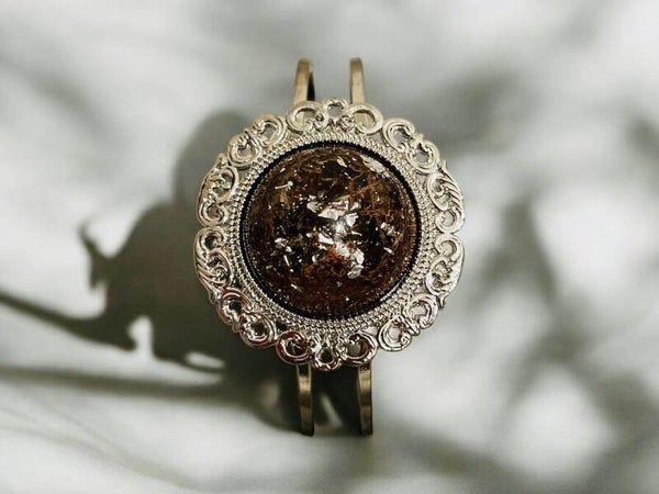 Deze prachtige zilverkleurige armband is een echte eyecatcher! De bloemvorm is afgewerkt met epoxy en subtiele glitters, wat zorgt voor een elegante en sprankelende uitstraling. Handgemaakt en uniek: er is slechts 1 exemplaar van elk ontwerp.