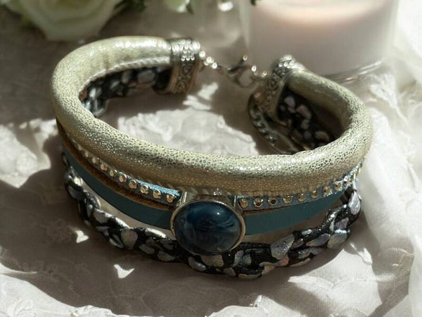 Deze unieke, handgemaakte armband combineert echt leer en PMU-leer voor een elegante en stijlvolle uitstraling. Met verschillende glitteraccenten, mooie stenen en charmante hangers is dit sieraad een echte eyecatcher.