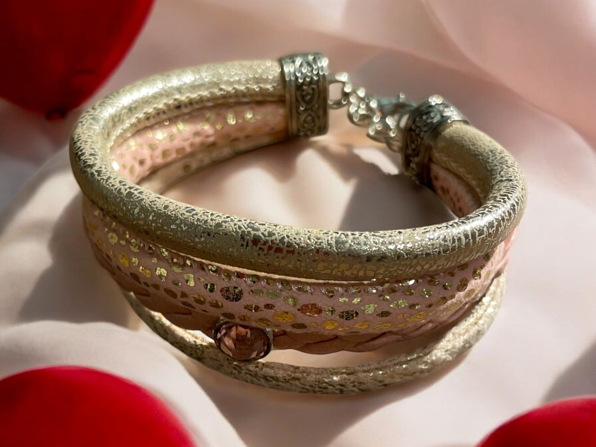 Deze unieke, handgemaakte armband combineert echt leer en PMU-leer voor een elegante en stijlvolle uitstraling. Met verschillende glitteraccenten, mooie stenen en charmante hangers is dit sieraad een echte eyecatcher.