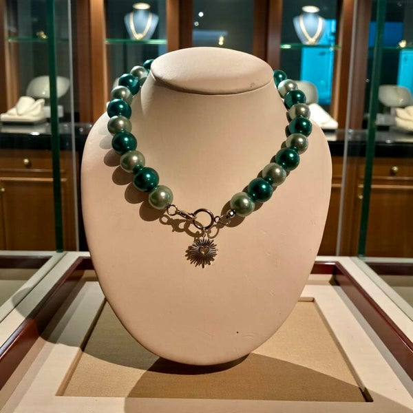 Voeg een vleugje kleur en klasse toe aan je outfit met deze prachtige handgemaakte ketting. De schitterende combi licht en donker groene glaskralen van 16 mm vangen het licht op een prachtige manier, waardoor de ketting subtiel maar toch opvallend glanst.